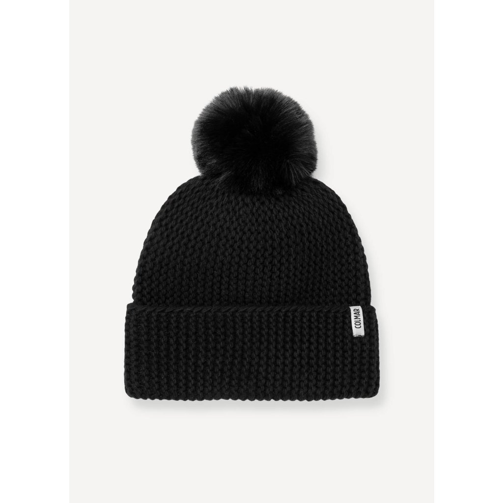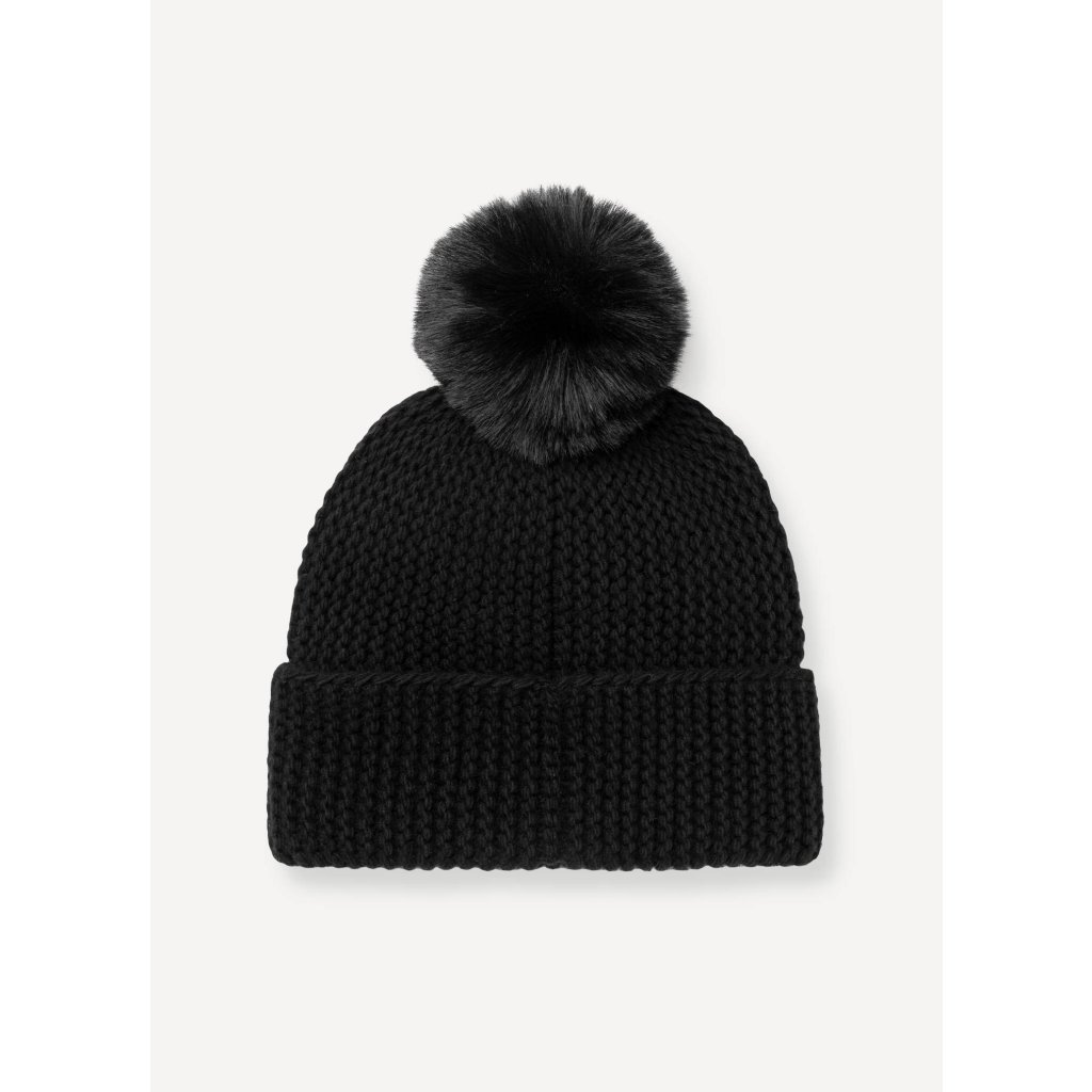 Tato sofistikovaná čepice ženského vzhledu je vyrobena ze speciálního měkkého vertikálního úpletu s pletenou nití, doplněná bambulkou a manžetou z umělé kožešiny.