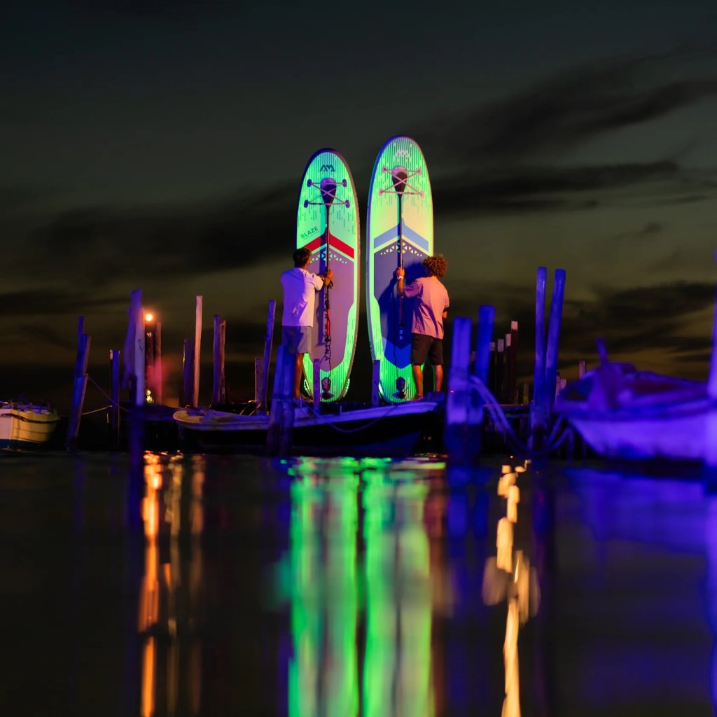 Inovace se setkává se vzrušením u Blaze a Raye, kteří jdou ve stopách Glow, prvních svítících SUP desek na světě. Užijte si pádlování ve dne i v noci s jejich fascinující svítivostí, díky které bude každý okamžik na vodě kouzelný. Všestranný design zajišťuje všestrannost v různých vodách a povětrnostních podmínkách. Díky stabilnímu a robustnímu tělu se plynulé veslování stává bez námahy. Díky naší špičkové technologii Drop-stitch, technologii ECO-PRINT a technologii svařování Heat Fusion jsou Blaze a Ray nejen lehčí, ale také extrémně šetrné k životnímu prostředí. Objevte budoucnost paddleboardingu s Blazem a Rayem.