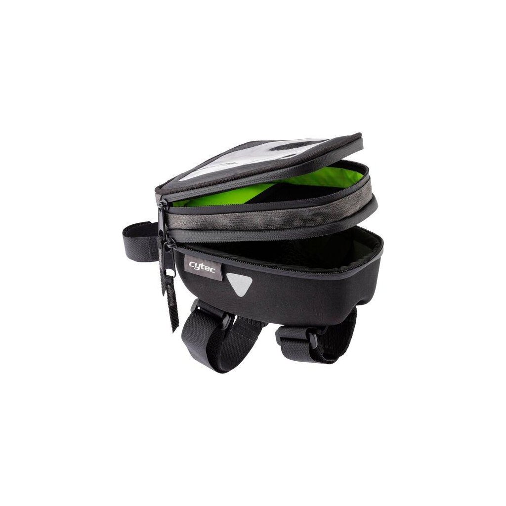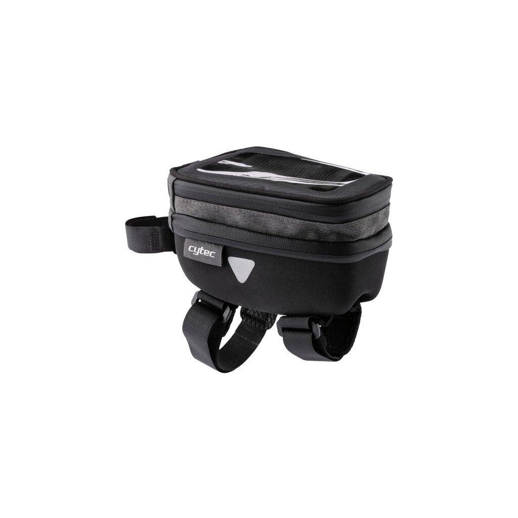Rozměrově stabilní taška na rám s okénkem na smartphone, se jednoduše připevní k horní trubce a hlavové trubce pomocí pásků na suchý zip.