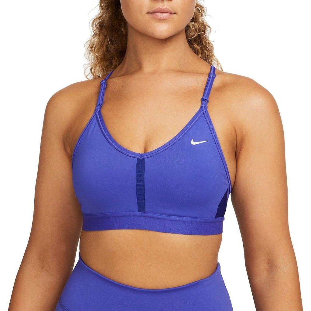 Sportovní podprsenka Nike Dri-FIT Indy ještě usnadňuje jednoduchou podporu pomocí řemínků, které se nastavují vpředu. Měkká tkanina (vyrobená z nejméně 50% recyklovaných polyesterových vláken) je navržena pro prodyšnost zepředu a zezadu pro případ, že se zapotíte. Díky snadno odnímatelným podložkám, které se zasunou shora, je to bez námahy pohodlné.