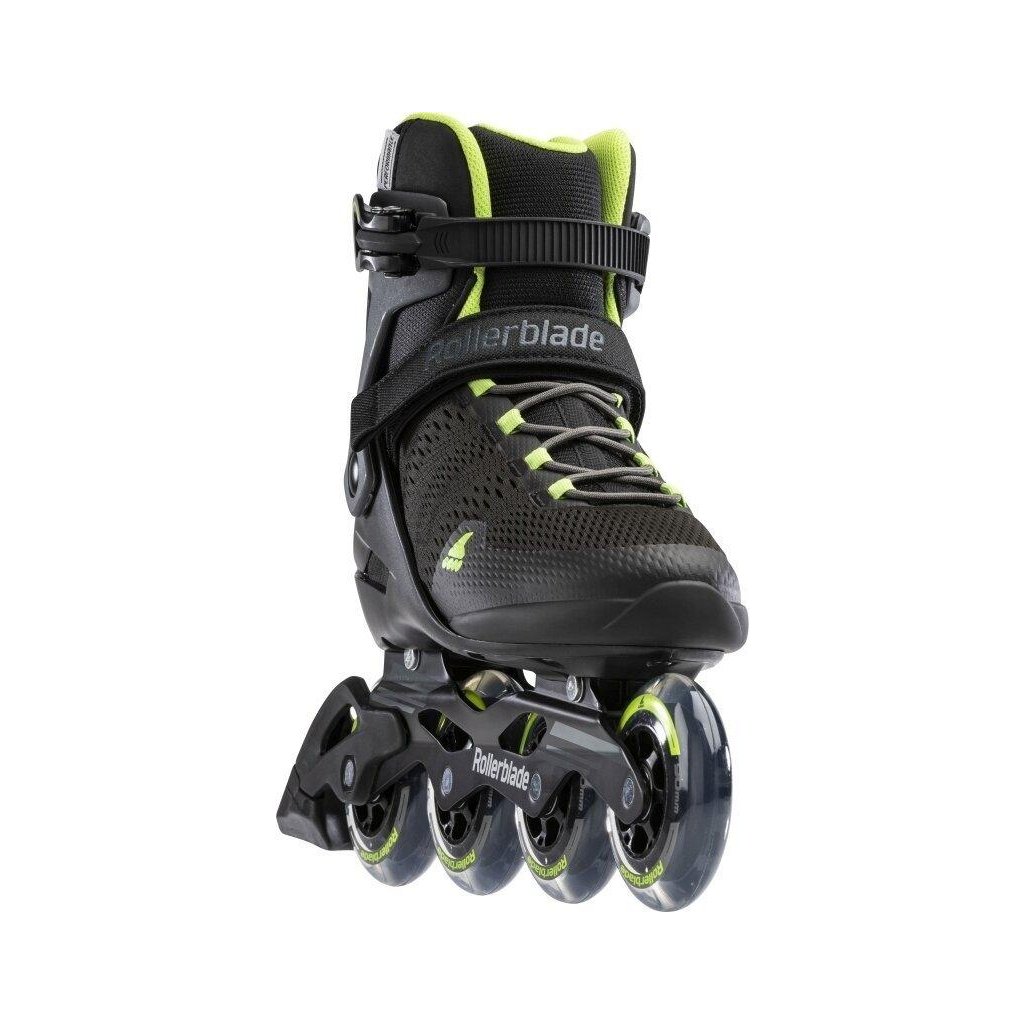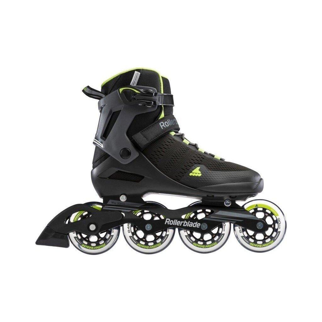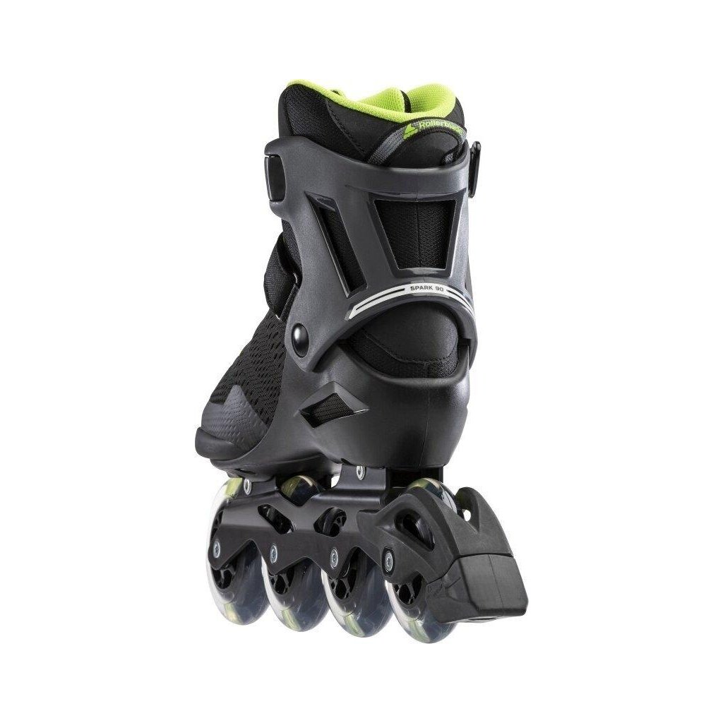 Pánské výkonné kolečkové brusle Rollerblade Spark 90 M. Vyšší konstrukce manžety se systémem zapínání na přezku, řemínek a šňůrky zajišťuje stabilitu a kontrolu, zatímco polstrovaná vložka ze síťoviny dodává prodyšnost.