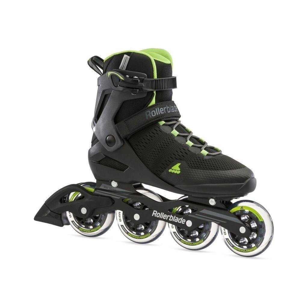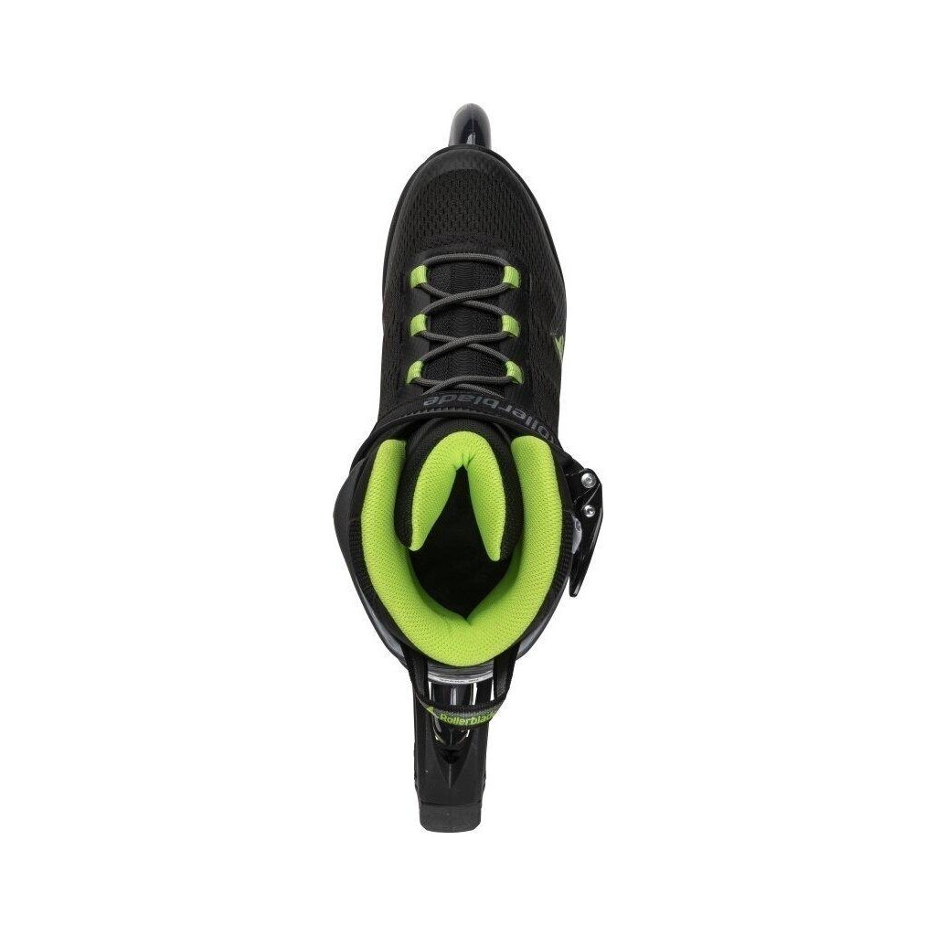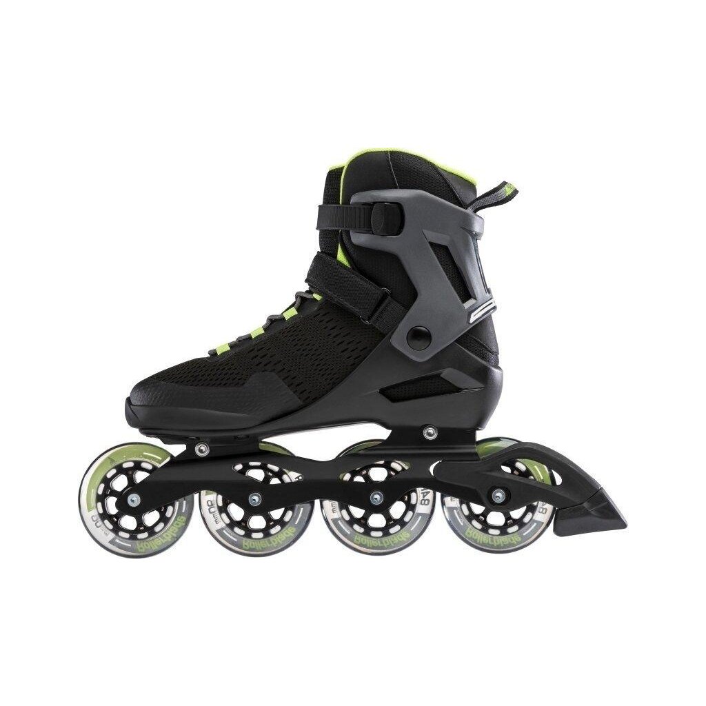 Pánské výkonné kolečkové brusle Rollerblade Spark 90 M. Vyšší konstrukce manžety se systémem zapínání na přezku, řemínek a šňůrky zajišťuje stabilitu a kontrolu, zatímco polstrovaná vložka ze síťoviny dodává prodyšnost.