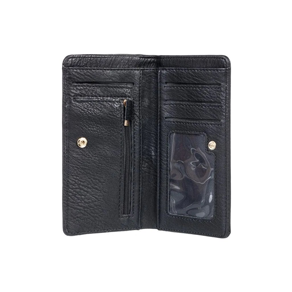 Dámská peněženka Roxy Crazy Wave. Materiál: 100% polyuretan Rozměry cca: 14,5 cm x 9 cm x 1,5 cm Zapínání na druk Uvnitř přihrádky na kreditky a bankovky, průhledné okénko a kapsa na zip Kovové logo Roxy