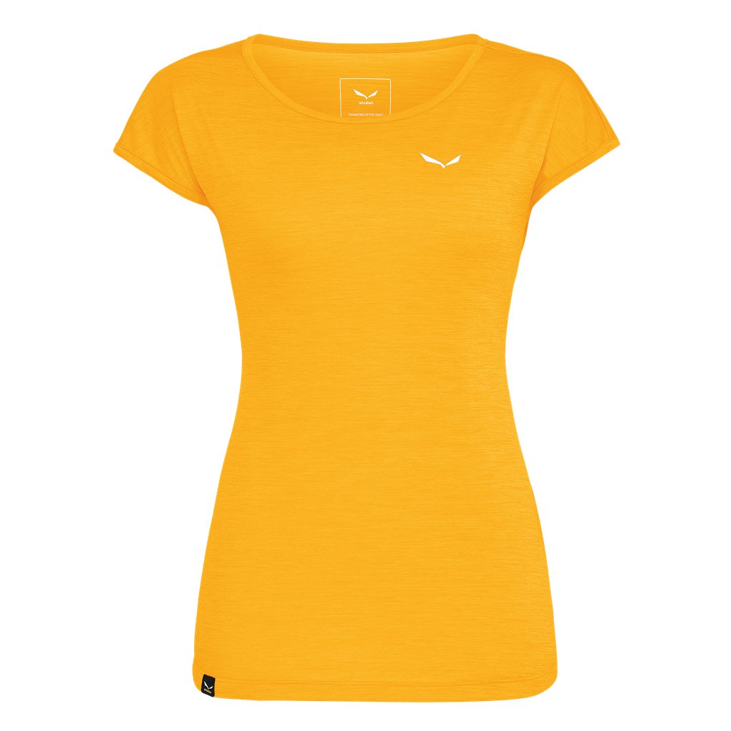 Dámské funkční triko Salewa Puez Melange Dry T-Shirt W z materiálu Dry'ton pro horké pěší túry do hor. Jeho prodyšná, obousměrně strečová, funkční polyesterová tkanina rychle odvádí vlhkost od pokožky, aby se předešlo přehřátí nebo ochlazení a zajistilo rychlé schnutí. Ve výrazném melanžovém vzhledu. Vzadu střih delší.