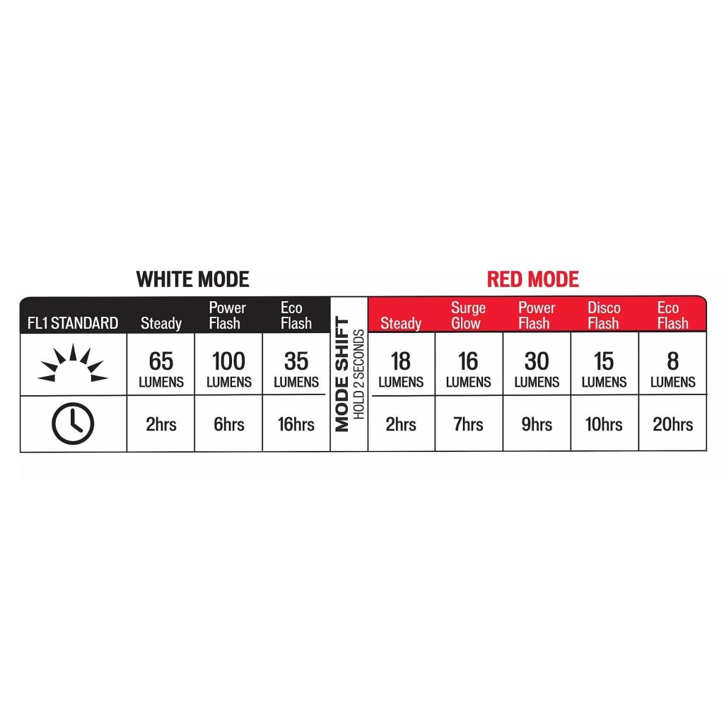 Režim Red Surge Glow: 16 lumenů po dobu 7:00 hodin