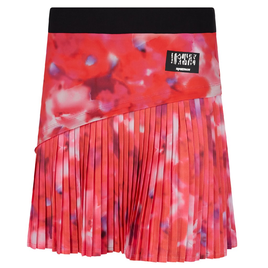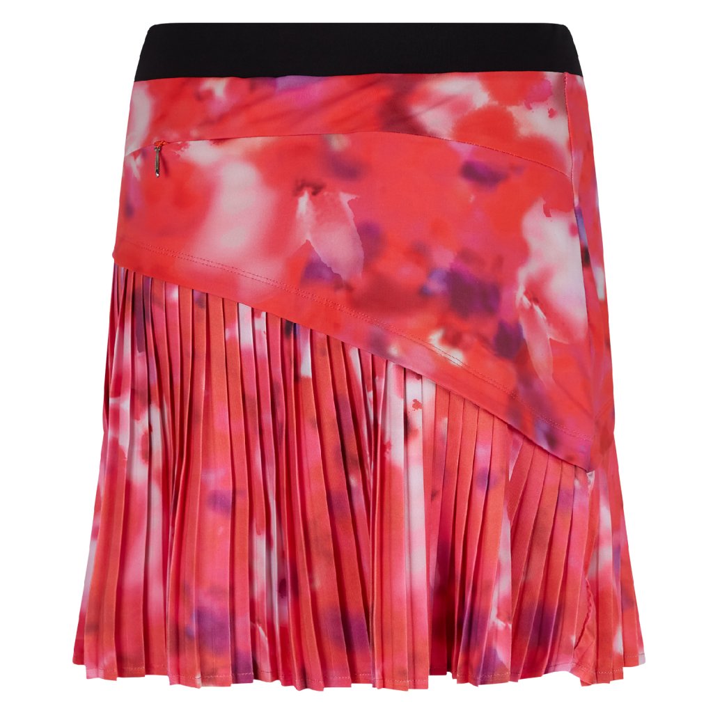 S touto golfovou sukní přitáhnete všechny pohledy! Kvalitní žerzej je potlačen módním batikovaným vzhledem a harmonicky kontrastuje s pasem s integrovanou gumičkou. Oči však upoutá důmyslné použití žerzejové plisované látky v sukni. V děleném švu na zadní straně je zakomponována kapsa na zip a na přední straně pod pasem je umístěn inovativní potisk s přenosným logem. Šortky, které jsou napevno spojeny se sukní, neomezují v pohybu.