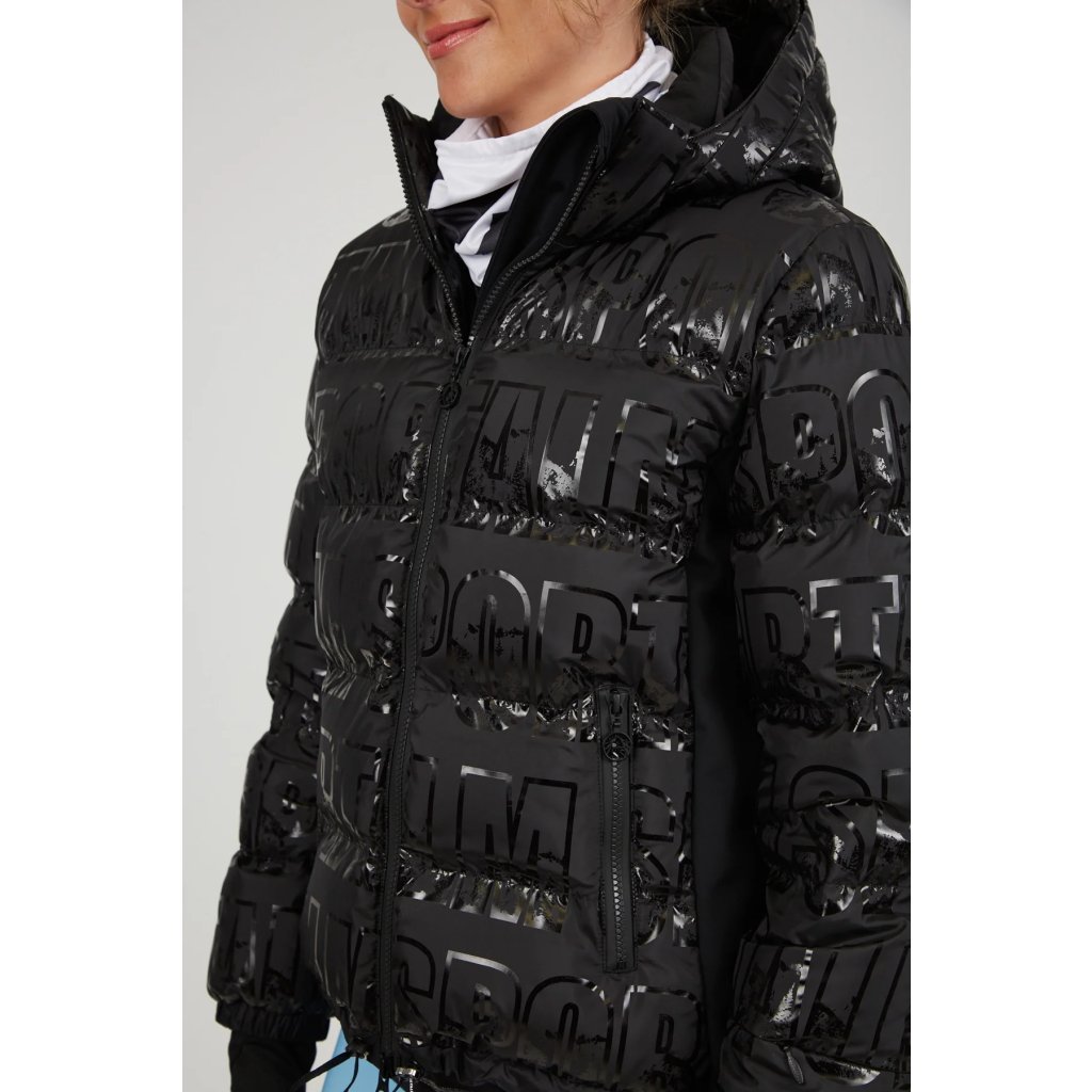 Tato bunda má dokonalý střih a moderní linie. Hlavní tkanina bundy dostává plnou pozornost. Černá nylonová tkanina je potištěna lesklým nápisem Sportalm. Linie nápisů jsou ještě více zvýrazněny prošívanými komorami, které jsou objemně vyplněny pravým prachovým peřím a poskytují příjemný pocit tepla. Stojatý límec s odnímatelnou kapucí a příjemné manžety slibují vysokou úroveň pohodlí. Dvě diagonálně všité kapsy na zip vpředu nabízejí prostor pro drobnosti. Šířku lemu lze individuálně upravit pomocí šňůrky. Vzhled doplňuje krásná podšívka s potiskem.